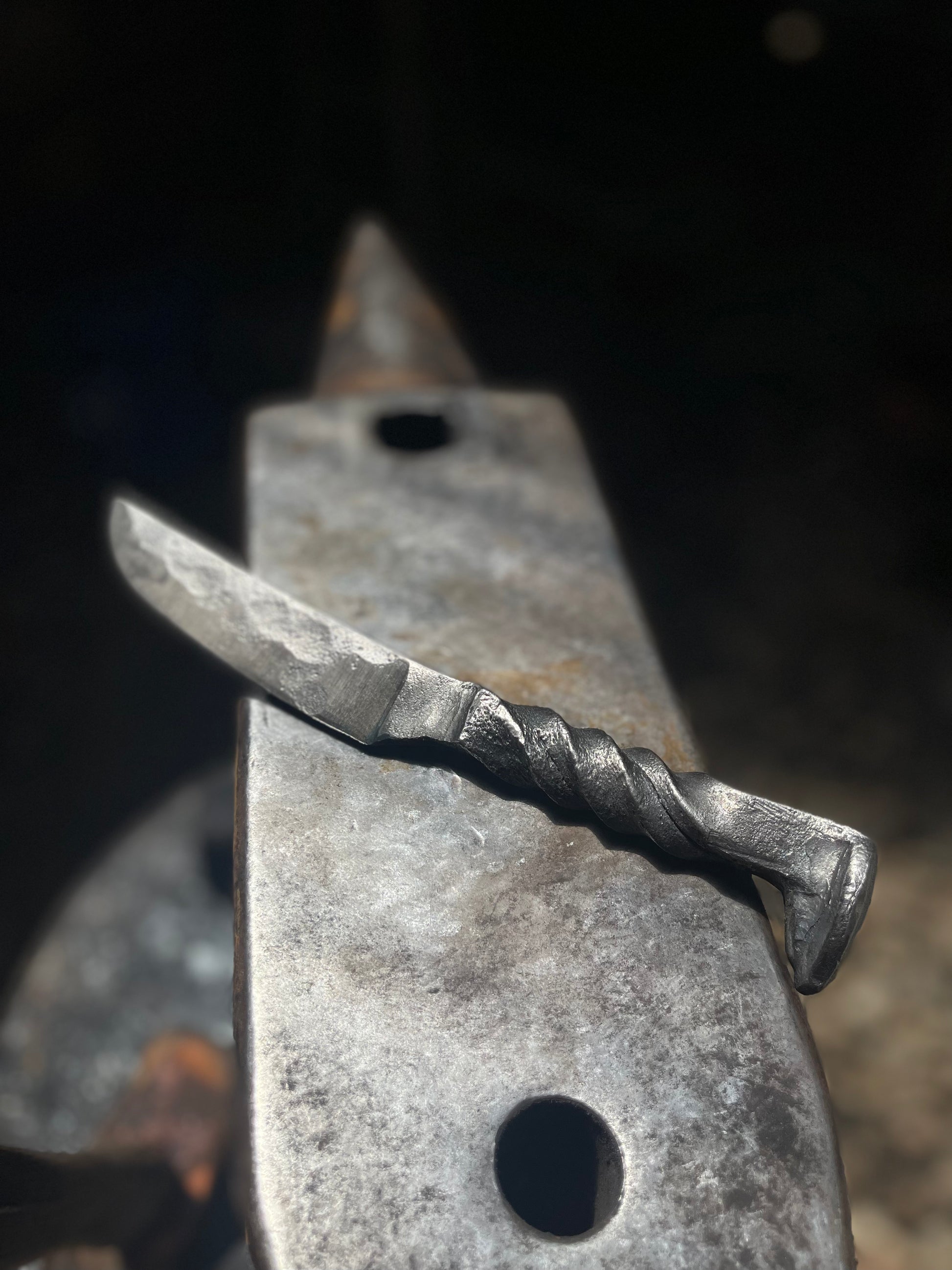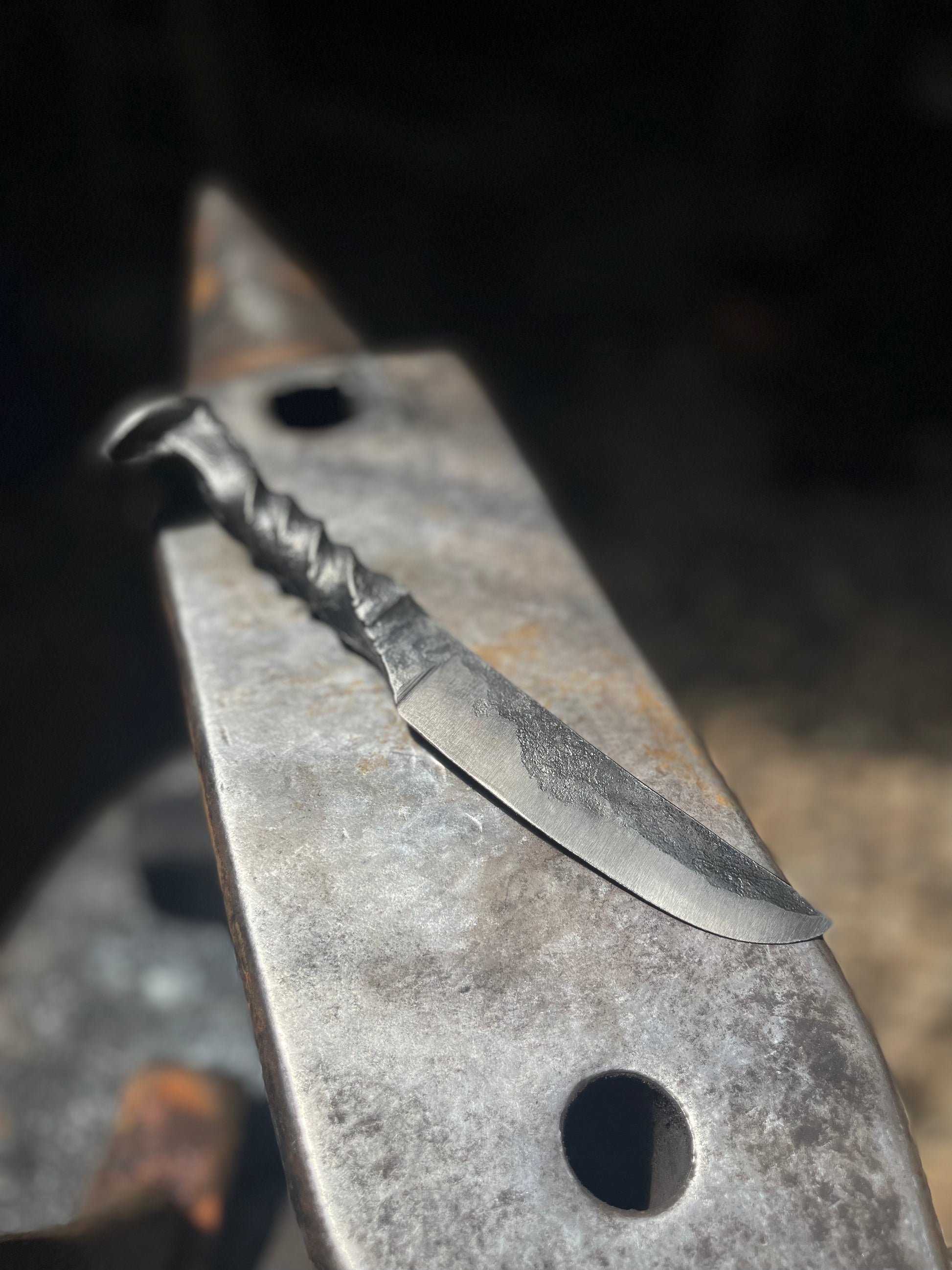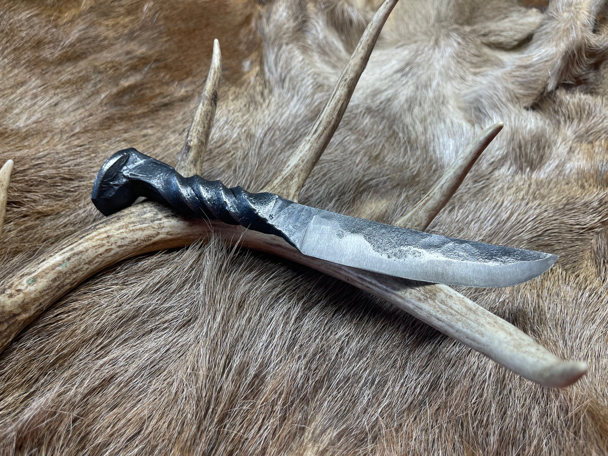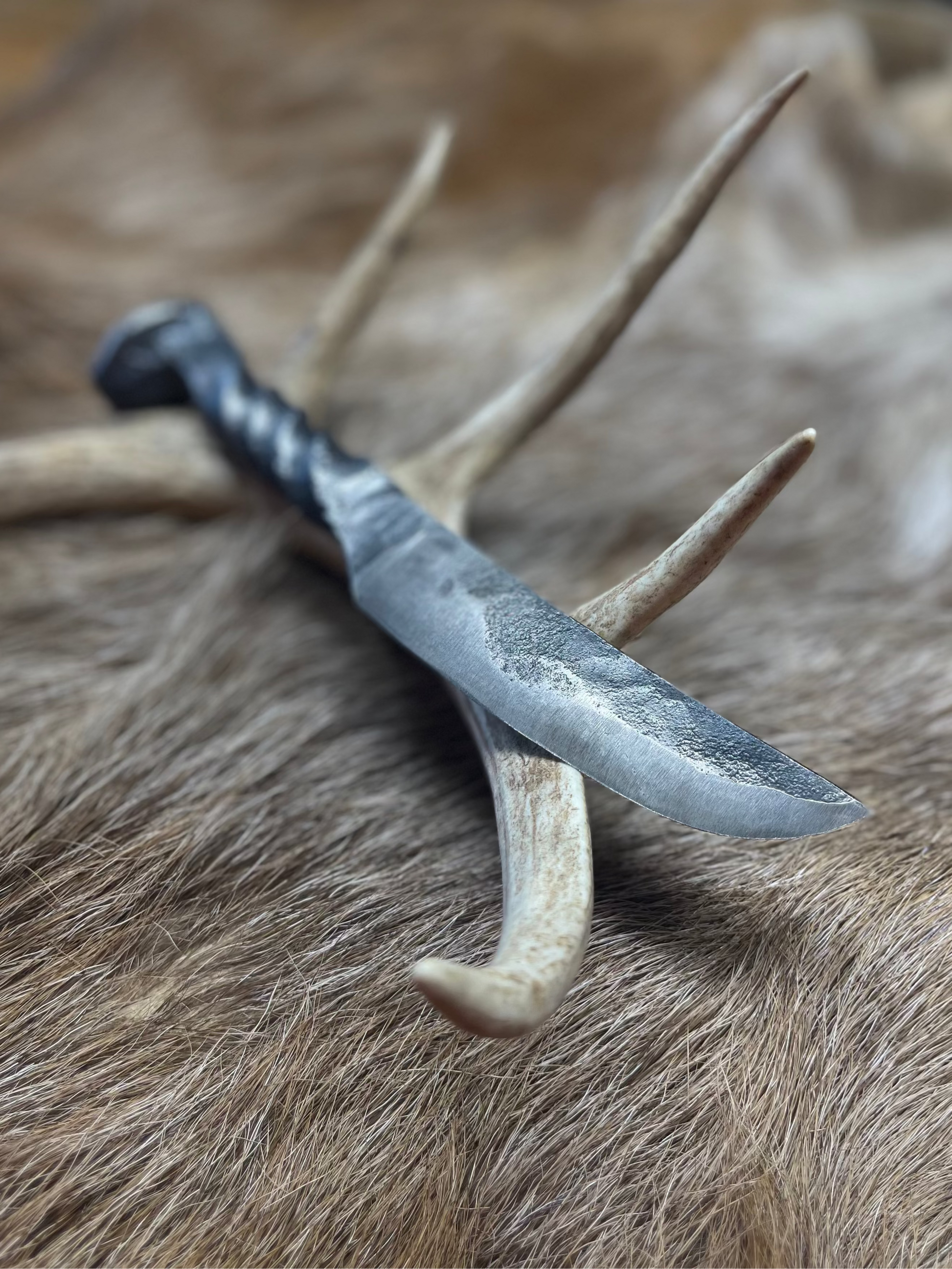 Hand-forged from reclaimed railroad spikes, the RSK-03 blends history, craftsmanship, and function, transforming steel with a story into a practical tool. Measuring between 8 1/2- 8 5/8" from tip to pommel, it boasts a brute de forge finish, preserving the raw texture of the forging process. The edge is carefully hand-honed on a whetstone to ensure sharpness.
