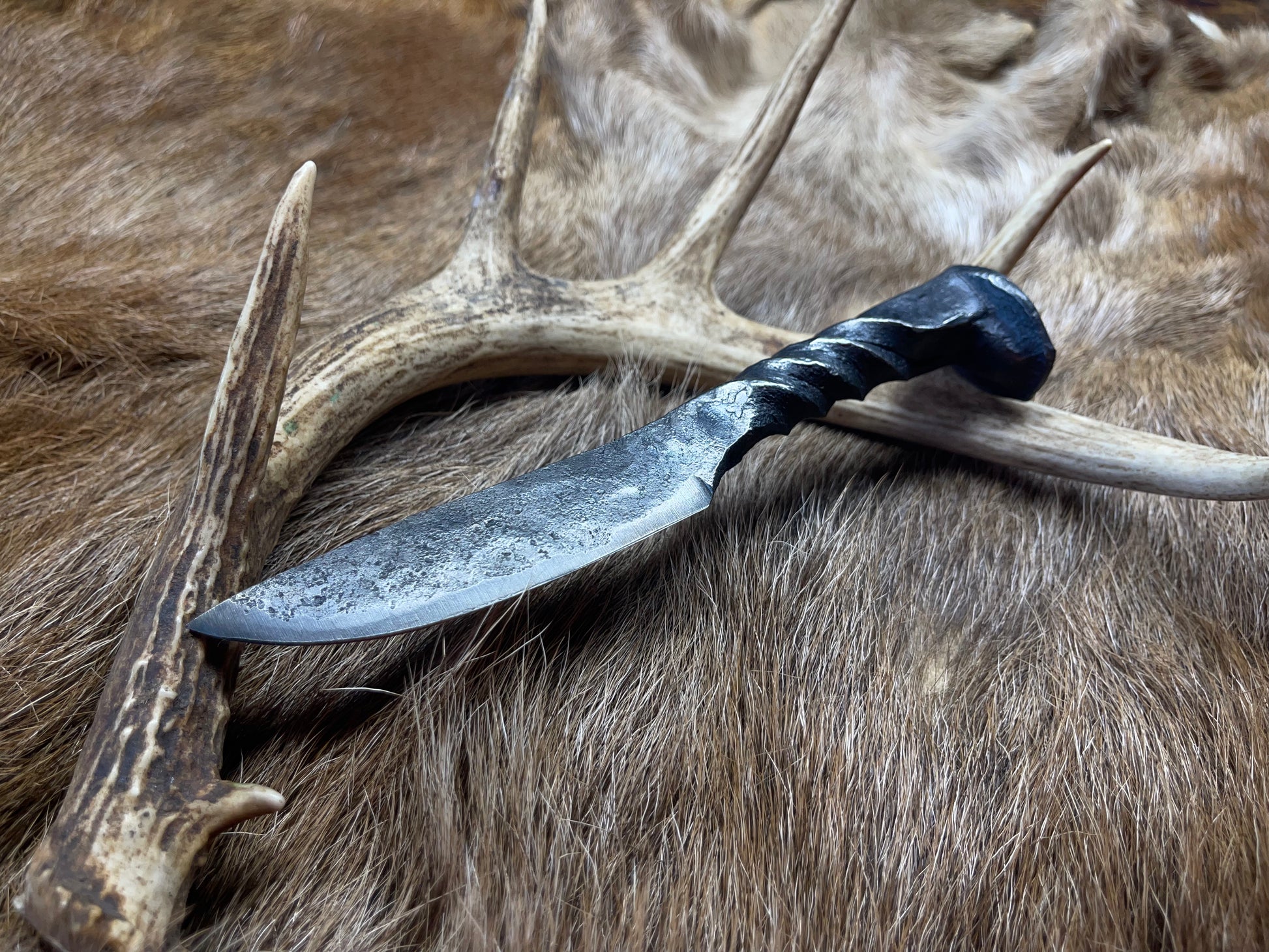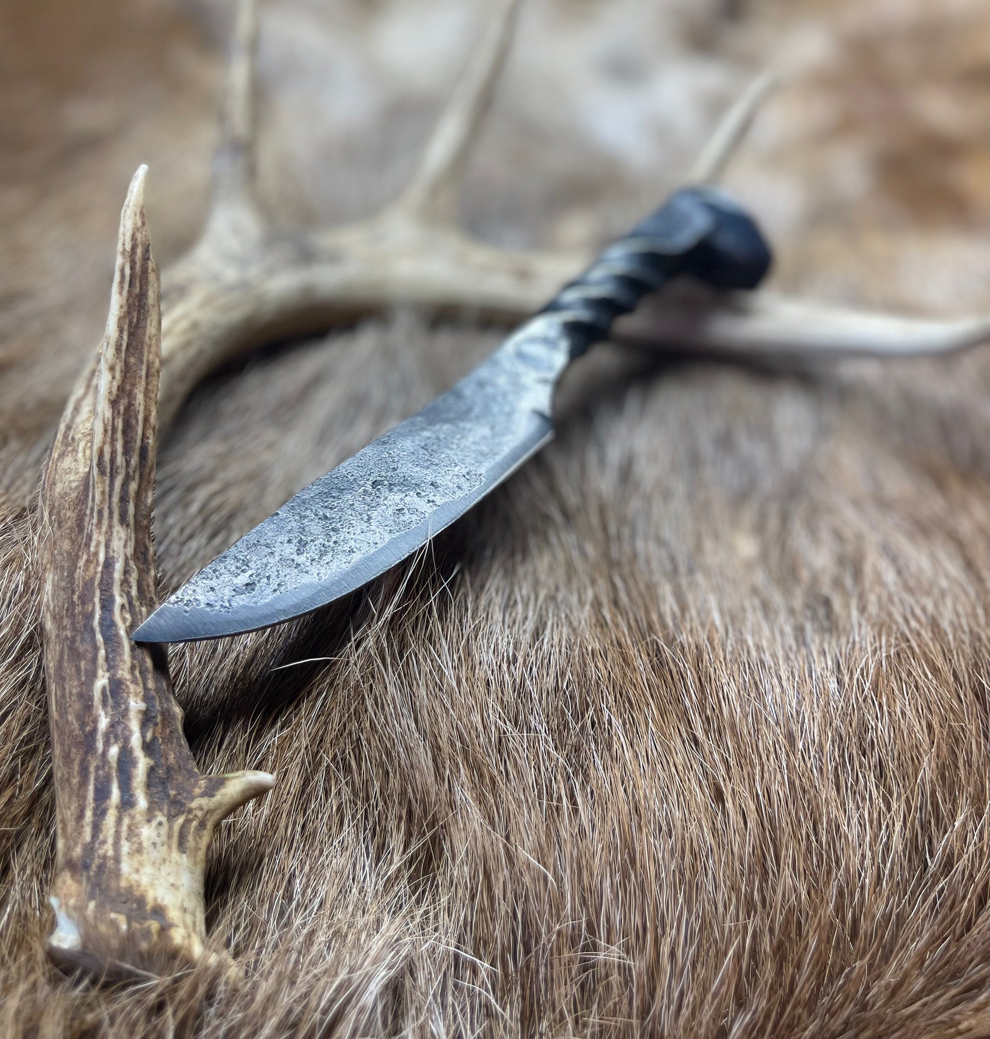 Hand-forged from reclaimed railroad spikes, the RSK-04 blends history, craftsmanship, and function, transforming steel with a story into a practical tool. Measuring about 8" from tip to pommel, it boasts a brute de forge finish, preserving the raw texture of the forging process. The edge is carefully hand-honed on a whetstone to ensure sharpness.